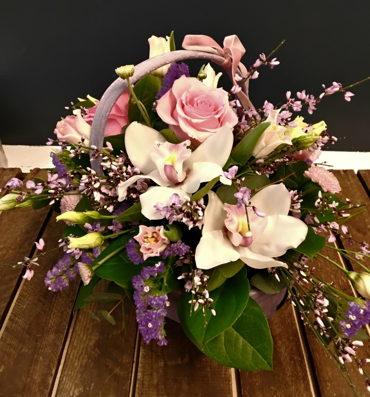 This is a very pretty basket of blooms with hues of pink and purple.